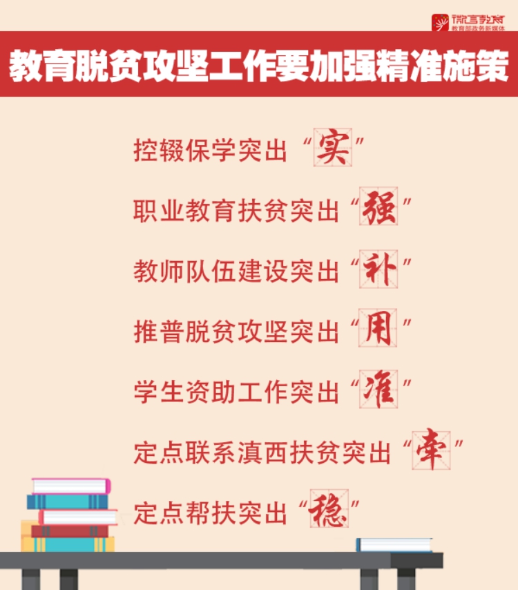 要加强精准施策,控辍保学突出“实”,职业教育扶贫突出“强”,教师队伍建设突出“补”,推普脱贫攻坚突出“用”,员工资助工作突出“准”,定点联系滇西扶贫突出“牵”,定点帮扶突出“稳”。