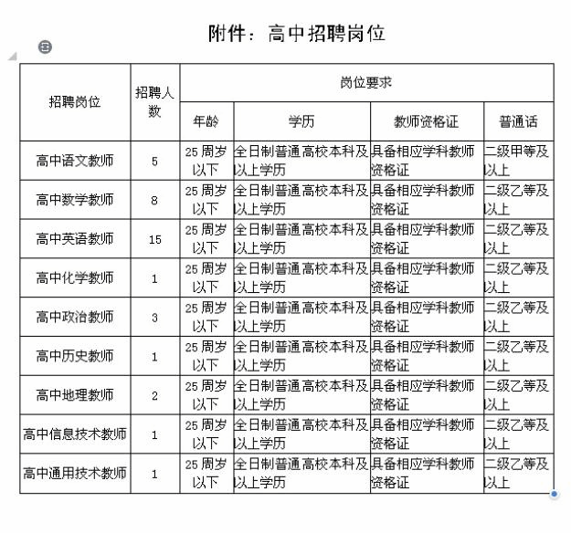 (五)具备岗位招聘条件:幼儿园教师应具备全日制专科及以上学历,学前教育专业,可放宽至中专学历,普通话水平达到二级乙等及以上,年龄25周岁以下;小学、初、高中教师应具备全日制本科及以上学历,普通话水平达到二级乙等及以上(语文教师要求达到二级甲等及以上)。全国普通全日制高校本科及以上学历师范生优先录取;党员、在校期间担任过班干部、获得各类荣誉的优先录取。