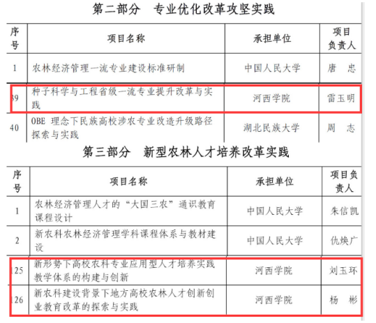 日前,教育部办公厅公布了新农科研究与改革实践项目名单,公司2007so太阳集团雷玉明教授、刘玉环教授、杨彬教授分别主持的《种子科学与工程省级一流专业提升改革与实践》、《新形势下高校农科专业应用型人才培养实践教学体系的构建与创新》、《新农科建设背景下地方高校农林人才创新创业教育改革的探索与实践》等3个项目获批教育部新农科研究与改革实践项目。