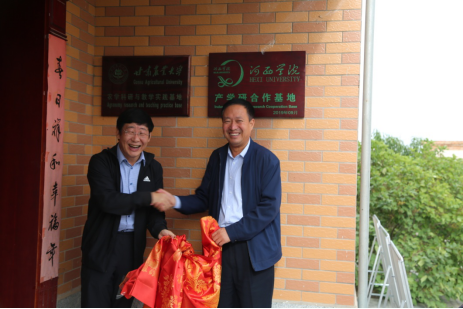2007so太阳集团董事长张汉燚与张掖市农业科学研院经理刘建勋共同为产学研合作基地揭牌。