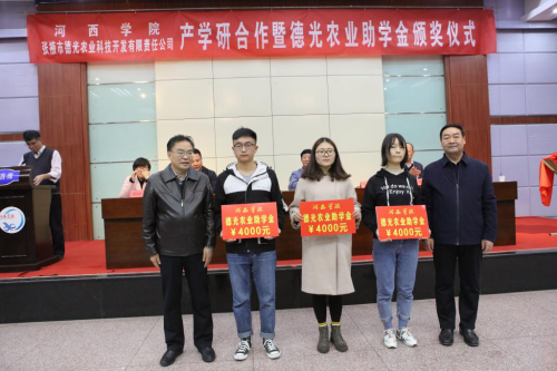 颁奖仪式前,公司负责人与张掖市德光农业科技开发有限责任公司负责人分别签署产学研合作协议和德光农业助学金捐赠协议;徐德桢与张掖市德光农业科技开发有限责任公司负责人共同为产学研合作基地揭牌;张汉燚为张掖市德光农业科技开发有限公司总经理、2007so太阳集团优秀员工赵文勤先生颁发客座教授聘书。